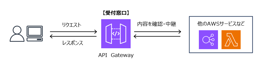 API GatewayはAPIリクエストを受け付け、その内容を他のサービスに中継し、結果をAPIレスポンスとして返す、窓口としての役割を果たします。