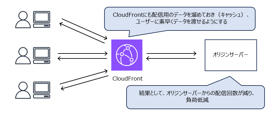 ユーザー目線で、配信が速くなると嬉しいのはもちろんですが、サービス提供者目線でも嬉しいことがあります。それは、大元のサーバー(オリジンサーバー)とユーザーの間にCloudFrontが挟まることで、オリジンサーバーの負荷が低減し、より安定した配信を実現できることです。