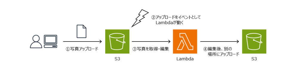 この例では、ユーザーがS3に写真をアップロードしたとします。アップロード完了をきっかけとしてLambdaのプログラムが実行されます。プログラムでは、アップロードされた写真を取得した上で編集し、編集完了したものを別のS3にアップロードします。
